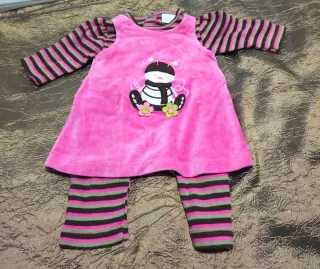 Conjunto de ropa para bebé de 6 meses. Marca Rotola - Mono de terciopelo rosa con estampado de osito y conejito. - Vestido rosa con estampado de pingüino y mangas a rayas. - Pantalón a juego con el vestido, de rayas rosas, negras y verdes.