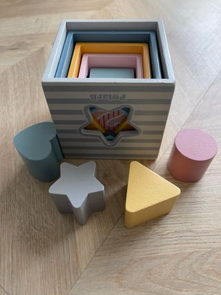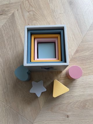 Juego de apilamiento de madera con formas geométricas. - Incluye un cubo apilable con diferentes tamaños. - Piezas de madera con formas de corazón, estrella, triángulo y círculo. - Colores pastel: azul, rosa, amarillo y gris.