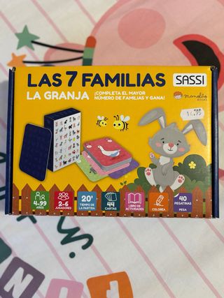 Juego de mesa Las 7 Familias de La Granja, de la marca Sassi. - Ideal para niños de 4 a 99 años. - Para 2 a 6 jugadores. - Tiempo de partida: 20 minutos. - Incluye 44 cartas. - Contiene libro de actividades y pegatinas. Usado una única vez.