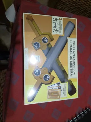 Juego de mesa Vamos a pegarnos con espadas de mentira. Incluye dos espadas de espuma y un mazo de cartas. - Dos espadas de espuma. - Juego de cartas incluido. - Ideal para jugar en familia.