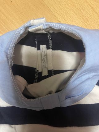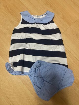 Conjunto de vestido sin mangas y cubrepañal a juego. - Vestido con rayas horizontales en azul marino y blanco. - Cuello estilo Peter Pan en azul claro con lazada. - Volantes en el bajo del vestido. - Cubrepañal en color azul claro.