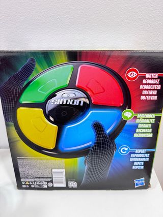 Juego electrónico de memoria Simon con luces y sonidos. - Diseño circular con 4 colores: rojo, verde, azul y amarillo. - Botones de control en la parte superior. - Incluye caja y manual en español.