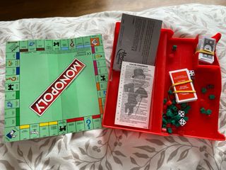 Juego de Monopoly, versión de viaje. Incluye tablero, fichas, dados y cartas. - Tablero plegable. - Caja organizadora roja. - Cartas de Caja de Comunidad y Suerte.