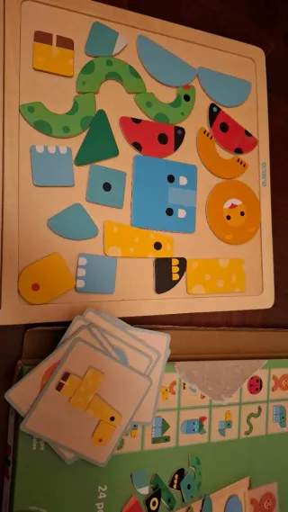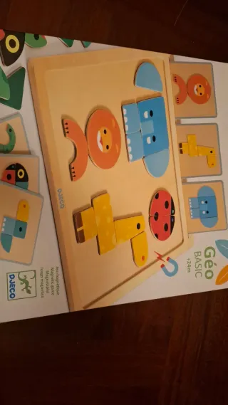 Juego de construcción magnético de la marca Djeco. - Piezas de madera con imanes. - Diseños coloridos y divertidos. - Fomenta la creatividad y la motricidad fina.