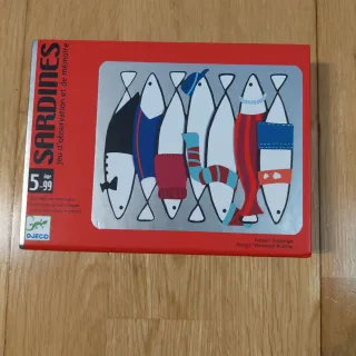 Juego de observación y memoria Sardines de Djeco. Ideal para desarrollar la atención y la memoria. - A partir de 5 años. - Para 2 a 4 jugadores. - Incluye 40 cartas sardinas y 10 cartas grandes de sardinas en lata