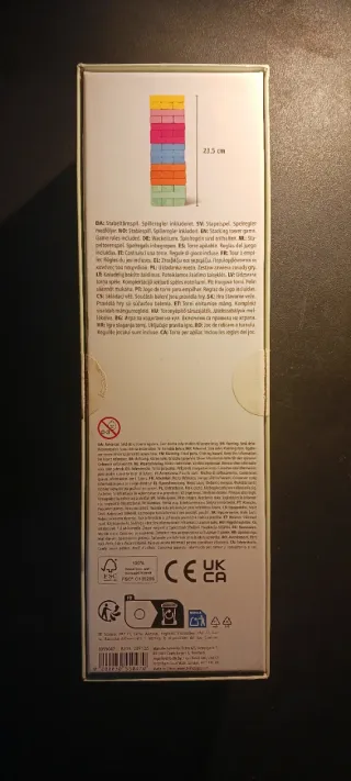 Juego de torre apilable tipo Jenga con bloques de colores de la tienda Flying Tiger. Incluye dado y manual con las reglas del juego, todo en su caja. Solamente ha sido usado un par de veces.