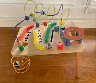 Mesa de actividades y estimulación para niños con múltiples opciones. De madera y colores vivos y atractivos. Altura en la parte mas alta 50 cm. Ancho 34. Largo 45. - Incluye laberinto para bolas y laberinto de cuentas para deslizar.