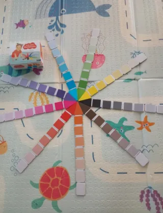 Juego educativo Tout-petit Montessori sobre los colores de Nathan. Incluye un sol de colores y 63 tarjetas y 1 central ( una esquina pegada con celo). Para aprender y enriquecer el vocabulario.
