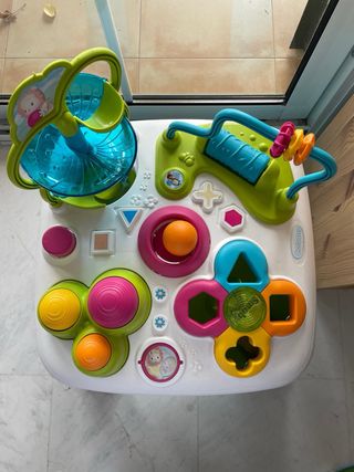 Mesa de actividades para bebés con múltiples juegos. - Incluye tobogán para pelotas. - Rueda giratoria. - Botones y formas para manipular. - Diseño colorido y atractivo.