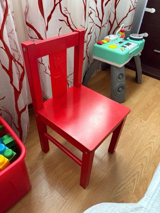 2 Sillas infantiles de madera pintada en color rojo junto con mesa a juego. Perfecta para habitaciones infantiles o zonas de juego. - Diseño con ositos tallados en el respaldo. - Estructura robusta y estable. Se entregarán limpias (en foto hay una pegatina y alguna mancha).