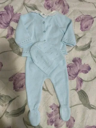 Conjunto de ropa de bebé de punto en color azul, ideal para los más pequeños. Incluye gorro y pijama. - Tejido suave y confortable. - Diseño clásico con detalles. - Incluye gorro a juego. - Pijama con pies incorporados.