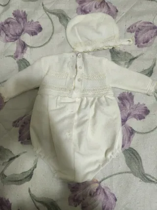 Precioso conjunto de ropa para bebé. - Incluye pelele y gorrito a juego. - Color blanco roto. - Tejido de punto suave. - Adornado con encaje y lazo.