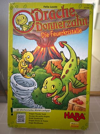 Juego de mesa Drache Donnerzahn: Die Feuerkristalle de HABA. Un juego de dados y recorrido con temática de dragones. cristales de fuego faltan dos son 60 y hay 58 - Autor: Felix Leicht - Ilustraciones: HABA - Incluye ERKLÄR-VIDEO con QR code - Títulos en varios idiomas: Dragon Thunder Tooth, Au pays des petits dragons, Draak Dondertand, Dragón Diente de Trueno, Drago Mordituono - Fabricado en Alemania