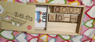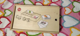 Juego de mesa de madera para aprender letras y formar palabras. Incluye fichas con letras y tarjetas con dibujos e imágenes. - Caja de madera con compartimentos. - Fichas de letras - Tarjetas de imágenes y palabras.