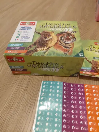 Juego de mesa Bioviva Desafíos Naturaleza Crono. Incluye dos cajas del juego, una con las reglas y otra con el juego principal, además de cartas, dados y pegatinas. - Juego de cartas y dados. - Temática de naturaleza y animales. - Fabricación francesa. - Edad recomendada: 7+ años.