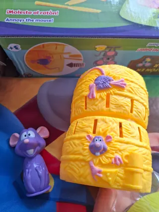 Divertido juego familiar PILLA AL RATON. Incluye un ratón y cuatro matamoscas de colores. - Un ratón de juguete con diseño de ratón herido. - Cuatro matamoscas de plástico en colores azul, amarillo, verde y rojo.