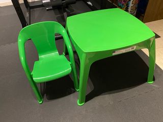Conjunto de mesa y silla de plástico para niños en color verde brillante. Ideal para actividades y juegos. - Material: Plástico resistente. - Color: Verde.