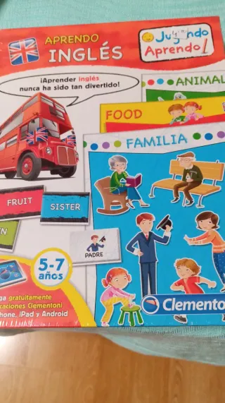 Juego educativo Clementoni para aprender inglés. - Incluye tarjetas con palabras en inglés y español. - Temáticas: Familia, Animales, Comida, Frutas. - Edad recomendada: 5-7 años. - Compatible con app Clementoni.