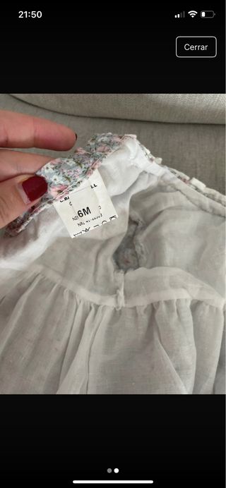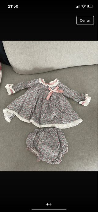 Conjunto de vestido y cubrepañal con estampado floral. - Vestido de manga larga. - Cuello con volantes y lazo rosa. - Puños y bajo del vestido con volantes blancos y detalle rosa. - Cubrepañal a juego.