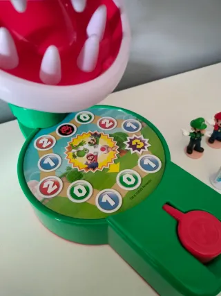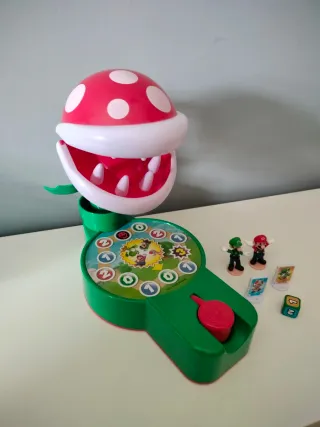 Divertido juego de mesa de Mario Bross con la planta piraña. - Incluye figuras de Mario y Luigi. - Tablero con números y personajes. - Dados y cartas. - La planta piraña es el elemento central del juego.