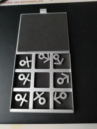 Juego de mesa compacto para llevar a cualquier parte. Ideal para viajes o para tener a mano en casa. - Diseño metálico. - Incluye fichas con símbolos. - Tablero plegable.