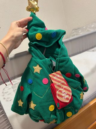 Adorable disfraz de árbol de Navidad de Primark, perfecto para las fiestas. Incluye el conjunto y unos leotardos rojas a juego. - Talla 0-3 meses (62 cm). - Diseño verde con adornos de estrellas doradas y círculos de colores. - Material suave y cálido. - Cierre de cremallera frontal. es ideal