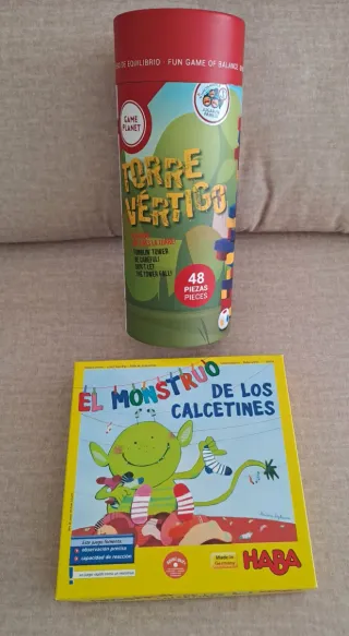 Lote de dos juegos: - El monstruo de los calcetines. Se usó una vez y se guardó. Tiene hasta las plantillas donde venían los calcetines. De Haba. - Y Torre vértigo. Juego de habilidad y lógica. Completo y en perfecto estado. De toy planet.