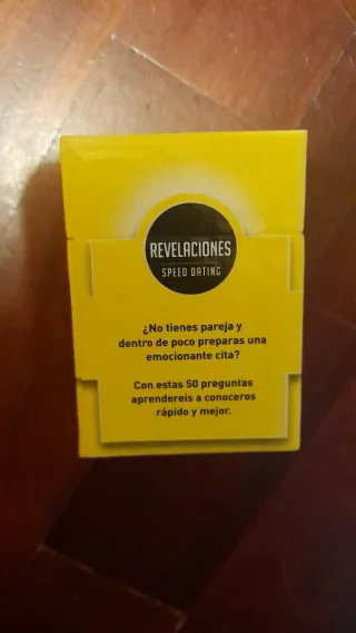 Juego de cartas para parejas llamado Revelaciones Speed Dating. Ideal para conocerse mejor. - Contiene cartas con preguntas y retos. - Diseño llamativo en color amarillo.