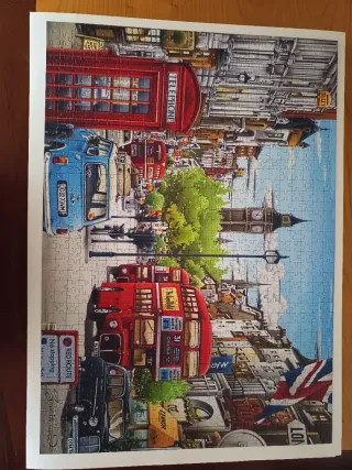 Puzzle de la marca Bluebird con escena de Londres. - 1000 piezas. - Ilustración de la ciudad de Londres con autobuses rojos y Big Ben.