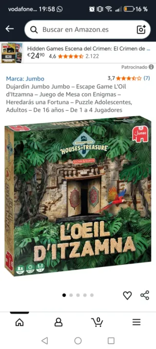 Juego de mesa de enigmas y puzzles de la marca Jumbo. - Título: L'Oeil d'Itzamna. - Temática: Escape Room, misterio. - Edad recomendada: A partir de 16 años. - Jugadores: De 1 a 4.