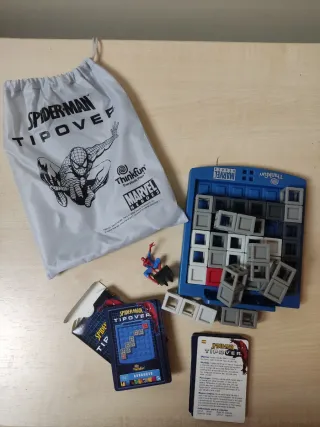 Juego de mesa Spiderman Tipover de Thinkfun. - Incluye bolsa de tela con diseño de Spiderman. - Figuras de Spiderman. - Tablero de juego. - Piezas de juego. - Tarjetas de desafío.