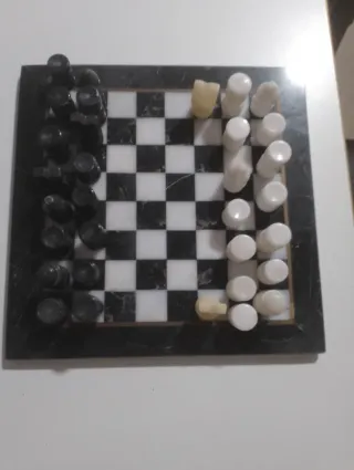 Elegante juego de ajedrez con tablero y piezas fabricadas en mármol. - Tablero con casillas blancas y negras. - Piezas de mármol en tonos claros y oscuros.