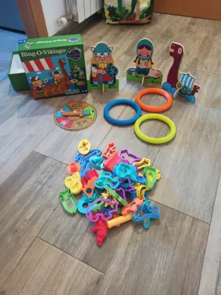 Pack de juego Ring-O-Vikingo junto con un surtido de 47 moldes para plastilina. Y juego la torre increíble de piezas de madera - Juego de mesa con temática vikinga. - Incluye figuras de madera y aros. - Diversos moldes de plastilina de diferentes formas y colores.