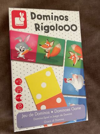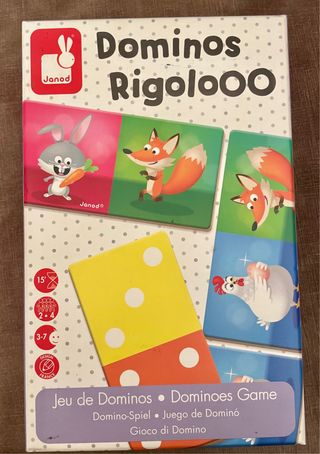 Divertido juego de dominó de la marca Janod, modelo Rigolooo. - Ilustraciones de animales como conejos, zorros y gallinas. - Incluye 28 piezas de dominó. - Edad recomendada: 3-7 años. - Duración aproximada de la partida: 15 minutos. - Para 2-4 jugadores. - Diseño y fabricación en Francia.