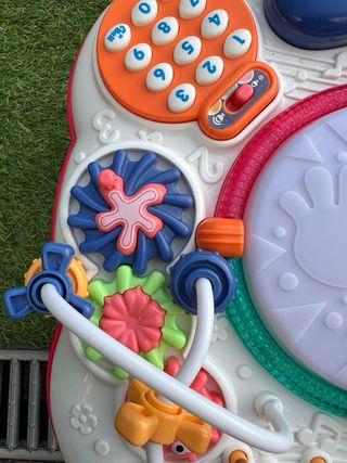 Mesa de actividades para bebés con múltiples juegos. - Piano con teclas de colores. - Teléfono con números. - Engranajes giratorios. - Guitarra. - Tambor central.