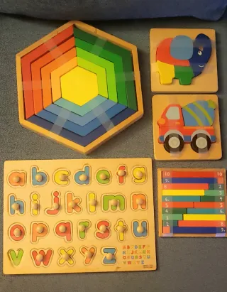2 Puzzles camión y elegante 1 Puzzle tablillas numericas 1 Rompecabezas Hexagonal piezas colores 1 Abecedario minúsculas con tiradores en cada pieza (falta la V)