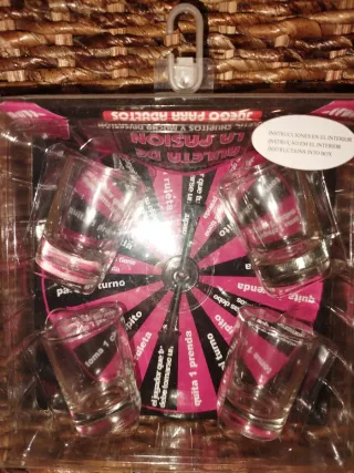 Juego de mesa para adultos con ruleta y chupitos. - Incluye 6 chupitos de cristal. - Ruleta con diferentes pruebas y retos. - Ideal para fiestas y reuniones.