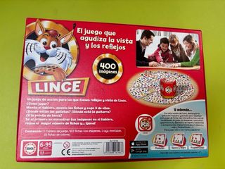 Juego de mesa familiar El Lince de Educa. Ideal para agudizar la vista y los reflejos. - Incluye 400 imágenes. - Tablero cambiable para una experiencia siempre diferente. - App gratuita con nuevas modalidades de juego. - Para edades de 6 a 99 años. Dimensiones: 37,5cm x 27,5cm x 5,8cm. Disponible envío y/o entrega en mano en Valladolid. Consulta mi perfil para más juguetes educativos.