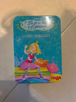 Juego de mesa La Princesa y el Guisante, la cama tambaleante de HABA. a partir de 4 años, de 2-5 personas. un fabuloso juego para desarrollar la habilidad y la motricidad fina. incluye además un cuento. viene en formato lata que sirve para el mismo juego y para llevarlo cómodamente en el bolso. en perfecto estado, casi sin uso