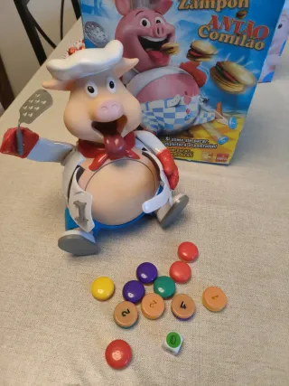 Juego de mesa Anton Zampon. - Incluye figura de cerdo, hamburguesas, espátula y dado. - Caja original.