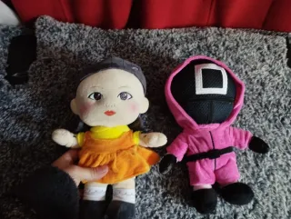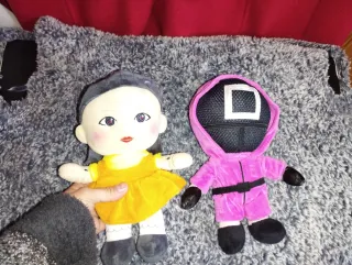 Set de dos muñecos de peluche inspirados en la serie El Juego del Calamar. - Muñeco de la niña del juego. - Muñeco del guardia con máscara. Los dos por 20 sueltos en 12€