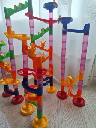 Divertido juego de construcción para crear recorridos de canicas. - Piezas de plástico de colores variados. - Tubos transparentes con detalles brillantes. - Incluye rampas, embudos y molinillos.