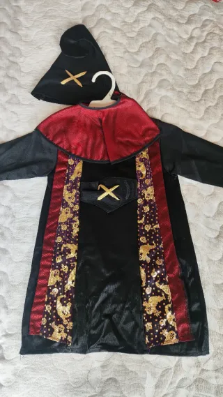 Disfraz de mago para bebé, ideal para los más pequeños. - Talla: hasta 18 meses. - Incluye túnica, Capela y sombrero a juego. - Diseño con detalles dorados y rojos. - Estampado de fantasmas y calaveras.