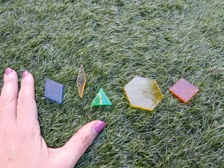 Conjunto de cinco tipos de piezas de juguete con forma geométrica y colores vibrantes. Ideal para mesa de luz. - Pieza azul en forma de rombo. - Pieza amarilla alargada. - Pieza verde triangular. - Pieza hexagonal blanca y amarilla. - Pieza naranja cuadrada.