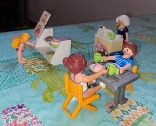 Figuras de Playmobil con puesto de dulces, mesa y sillas para merendar