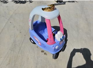 Cochecito infantil de juguete, ideal para que los más pequeños disfruten al aire libre. Su diseño es divertido y colorido. - Color principal azul lavanda. - Detalles en rosa y blanco. - Corona dorada decorativa en la parte superior. - No se ha usado nada