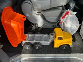 Camión de juguete grande con volquete naranja y cabina amarilla. Perfecto para jugar al aire libre. - Volquete de gran capacidad. - Ruedas resistentes.