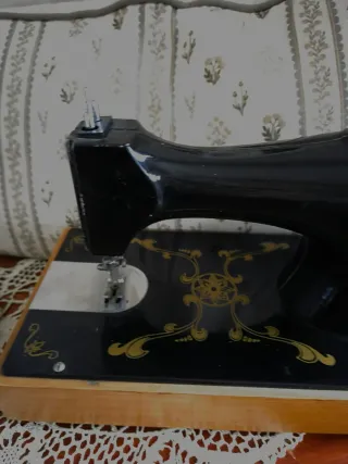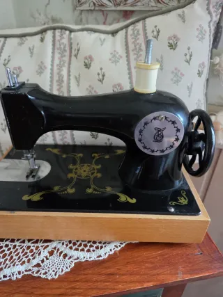 Antiguo juguete máquina de coser para muñecas , juguete antiguo,de color negro con detalles dorados. Mide 25 x 13 y de alto unos 20 cm en total - Base de madera. - Diseño vintage.