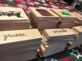 Cajón con pictogramas de madera antiguo. La caja y algunas piezas pueden tener defectos puntuales por el paso del tiempo. Faltan piezas como puede verse en una de las imágenes. No se asegura que coincidan palabras escritas con imágenes. Las piezas que contiene se pueden ver en las imágenes