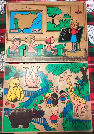Lote de material educativo antiguo de madera, procedente de entorno escolar/guardería. Incluye: 2 puzzles encajables completos, del mismo estilo y época. 1 pieza adicional suelta (figura de maestra con pizarra), original del mismo material, válida como recambio o decoración. Características: Madera maciza con ilustración serigrafiada original. Temática didáctica (aula escolar y zoo). Piezas grandes, diseño clásico europeo. Completos, sin piezas perdidas. Desgaste visible por uso y edad, coherente con materiales de los años 60–70 (ver fotos). Ideales para: Colección de juguetes antiguos. Decoración vintage infantil. Atrezzo